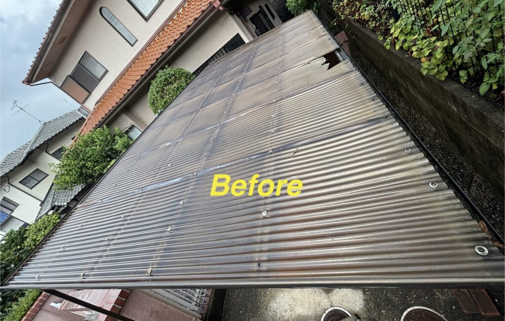 カーポート屋根の破損で”波板の張り替え”になります。